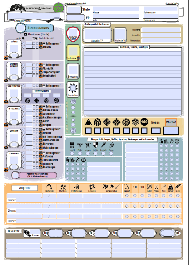 Desweiteren werden bei beiden Varianten, die Werte in den Fähigkeitsfeldern und Rettungswürfen automatisch mittels JavaScript berechnet, wenn man die Attributswerte einträgt