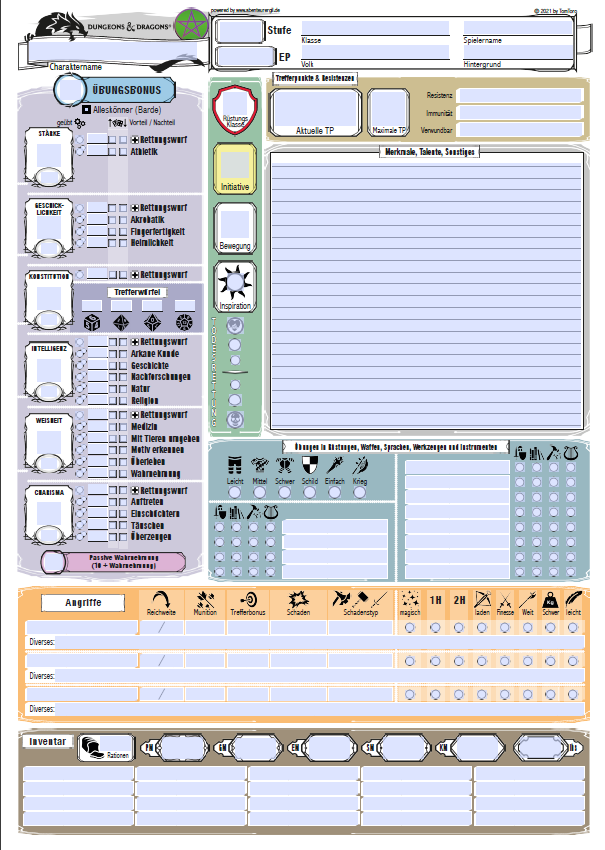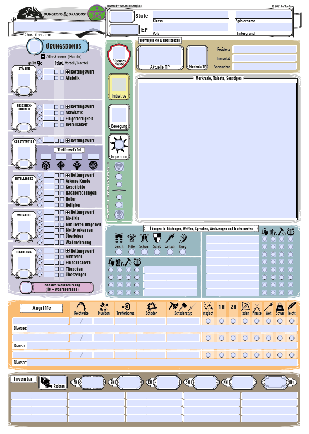 Dies stellt den in intensiver Zusammenarbeit erstellte Charakterbogen der Abenteurergilde dar. Die Idee dahinter war es ihn so kompakt und simpel zu gestalten wie nur möglich und alles notwendige auf 1 A4 Seite zu kriegen. Farbliche Abhebungen sorgen dafür, dass Anfänger sowie auch alteingesessene Hasen, die entsprechenden Werte schneller finden können. Das PDF ist komplett digital ausfüllbar, kann aber auch ohne Weiteres mit herkömmlichem Stift ausgefüllt werden. Es gibt hierzu 4 Varianten:
