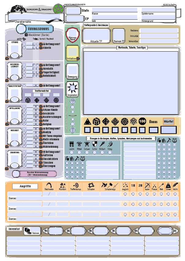 Variante 3 / 4: Diese Beiden Varianten sind eigentlich das selbe wie Variante 1 & 2 (also mit und ohne Hilfslinien im Hauptfeld), mit dem Unterschied dass das Hauptfeld etwas kleiner geraten ist, dafür aber eine "Diceroller" Leiste eingefügt wurde. Sprich es ist möglich, auf diesem Charakterblatt zu Würfeln. Gebt dazu einfach in die entsprechenden Würfeltyp-Fenster die Anzahl der Würfel ein die gewürfelt werden soll (du kannst auch verschiedene miteinander werfen) und im Ergebnisfeld wird dir das entsprechende Ergebnis angezeigt. Eine natürliche 20 sowie eine natürliche 1 werden hier explizit als Popup ausgegeben.