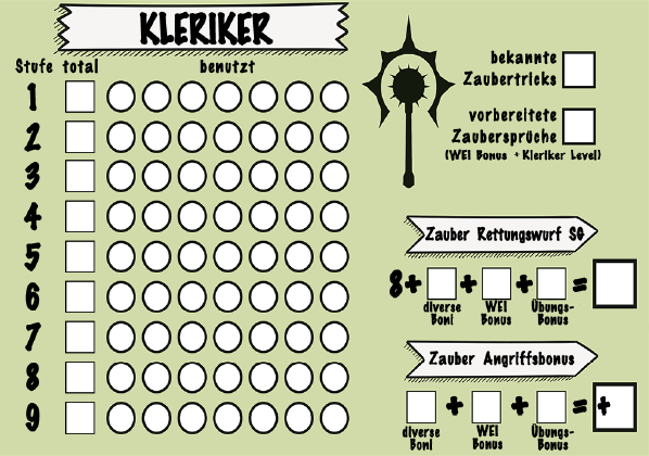 Diese Zauberslot Karten gibt es für jede Klasse und es sind bereits alle 13 im PDF vorhanden. Ursprünglich eher für zauberwirkende Klassen gedacht, sollen sie die Übersicht über die bereits verbrauchten / noch vorhandenen Zauberplätze erleichtern. Der Zauber Angriffsbonus / Zauber Rettungswurf SG ist ebenfalls aufgeschlüsselt vorhanden und kann mit den enstprechenden Werten bestückt werden. Desweiteren hat es noch klassenspezifische Checkboxen / Werteboxen die nützlich sind (z.B. Göttliche Macht fokussieren beim Kleriker etc..). Die Karten an sich sollten für die entsprechende Klasse selbsterklärend sein. Beim Kämpfer / Schurken sind die Karten speziell auf die zauberwirkenden Subklassen ausgerichtet (Mythischer Ritter beim Kämpfer, Arkaner Betrüger beim Schurken), sie können jedoch auch ohne weiteres von anderen Subklassen verwendet werden, man muss dann einfach die Zauber-Fähigkeiten für sich selbst ausklammern.